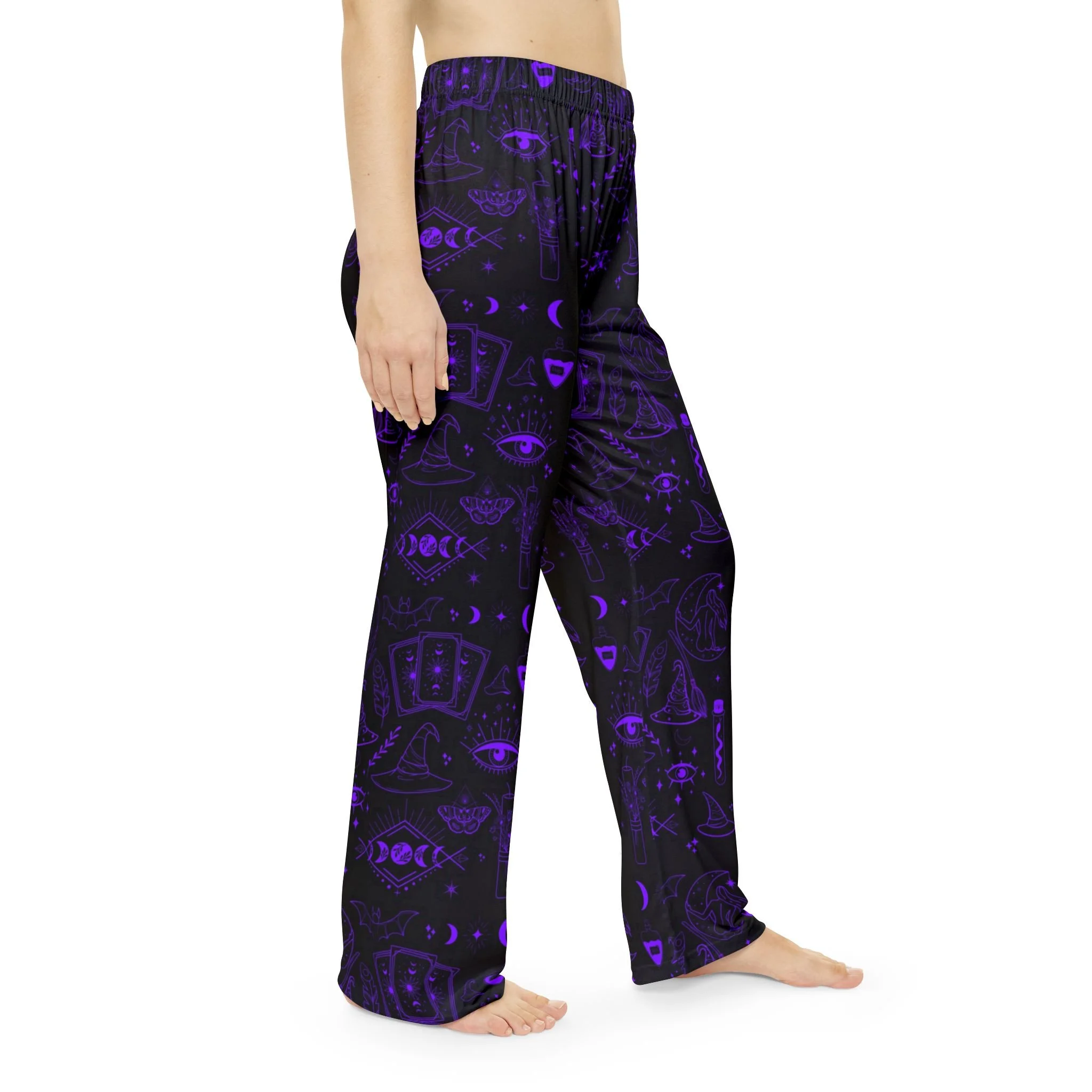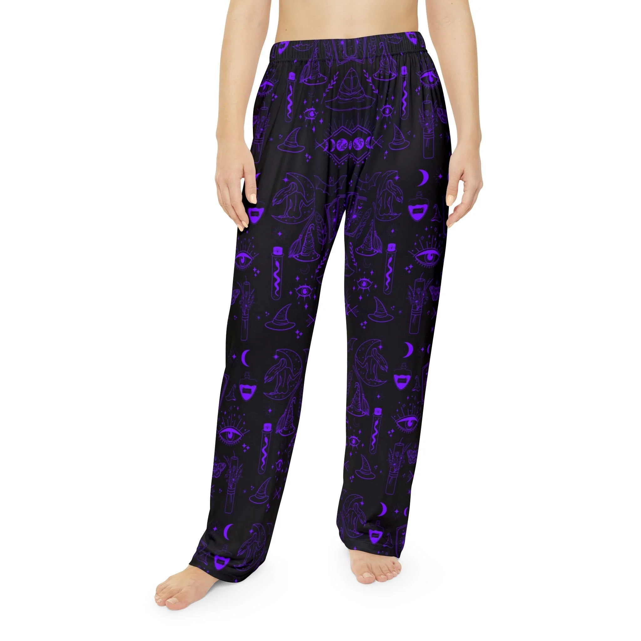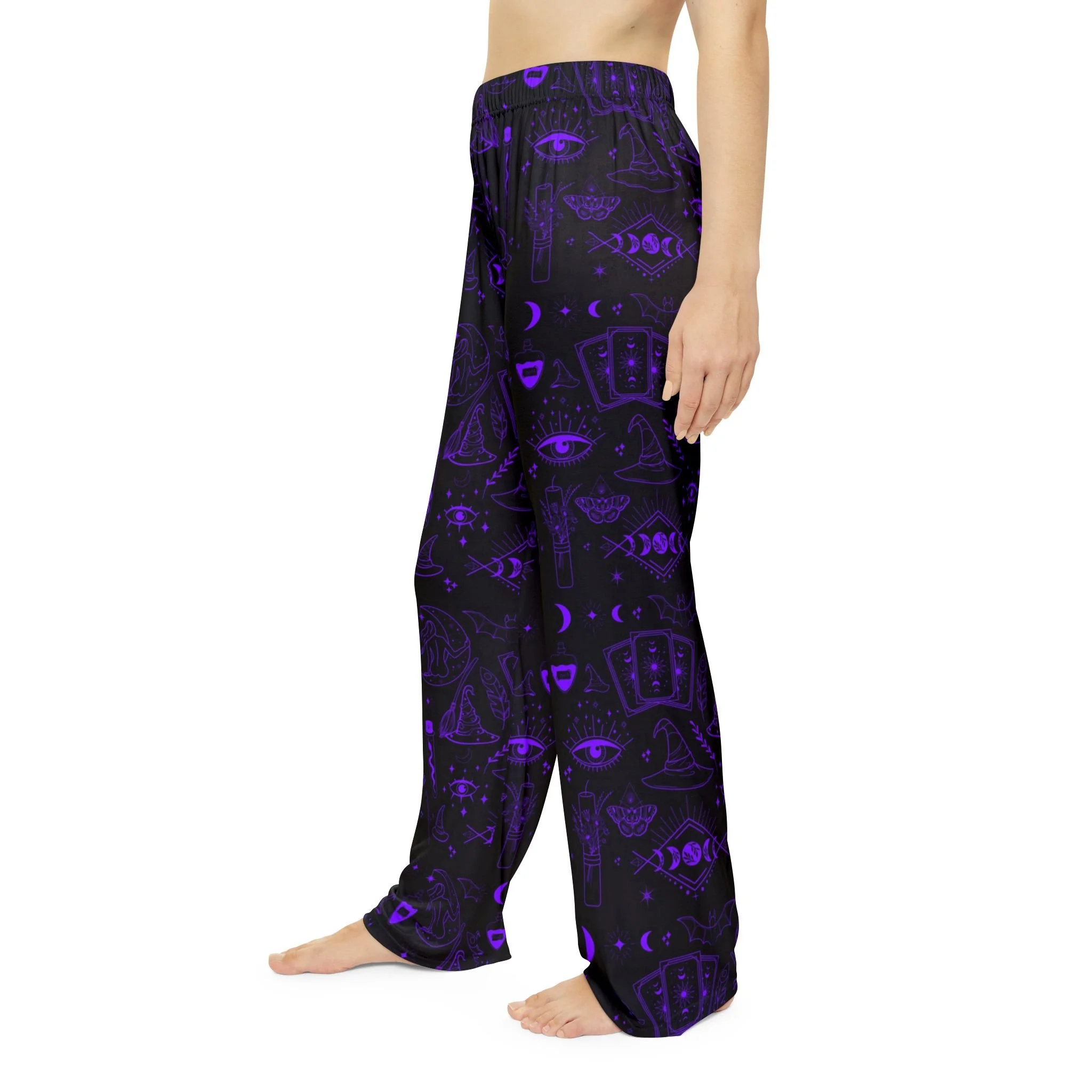 These black pajama pants feature rich purple line art depicting a dreamy collection of witchy and occult symbols. The lunar symbols and tarot cards are an ode to intuition, transformation, and the many faces of the witch.
