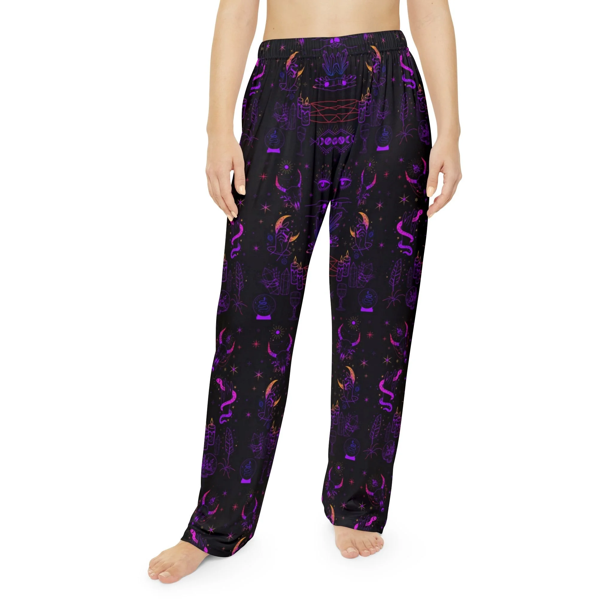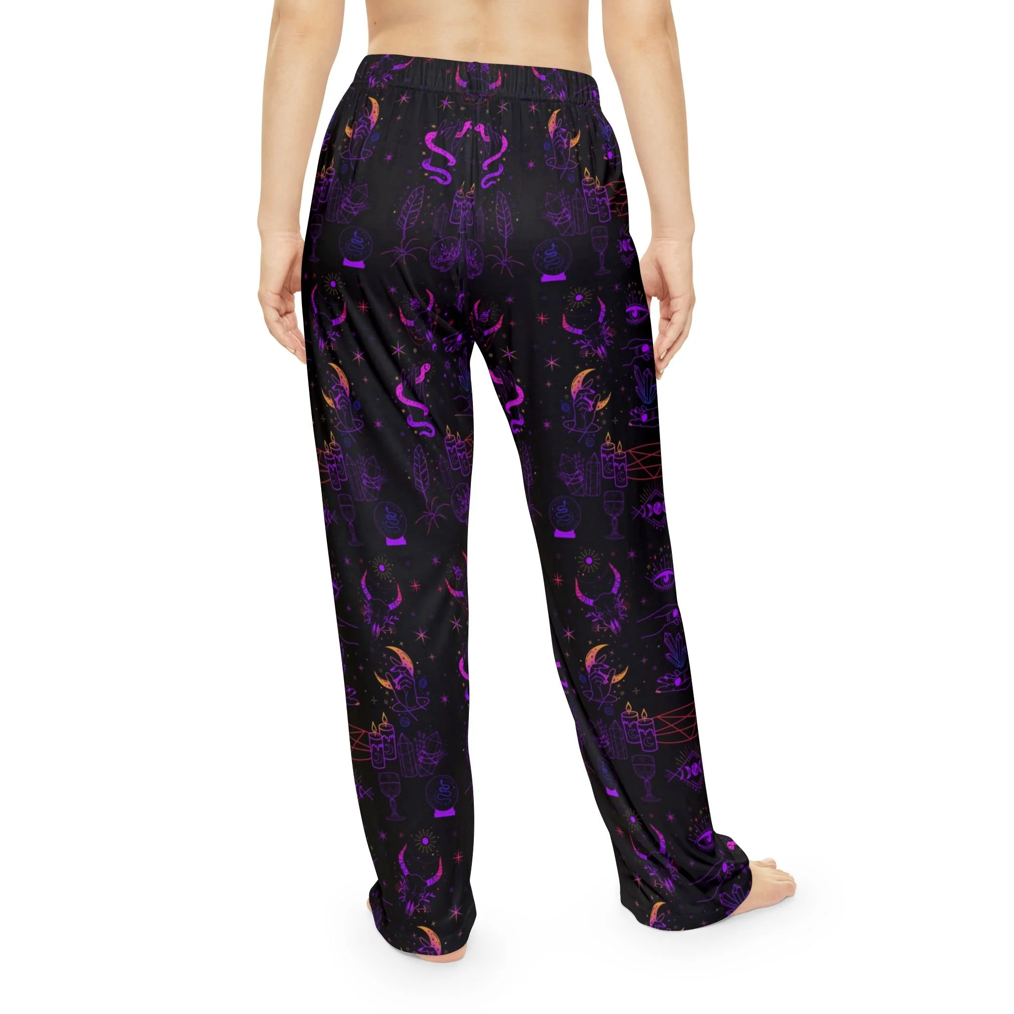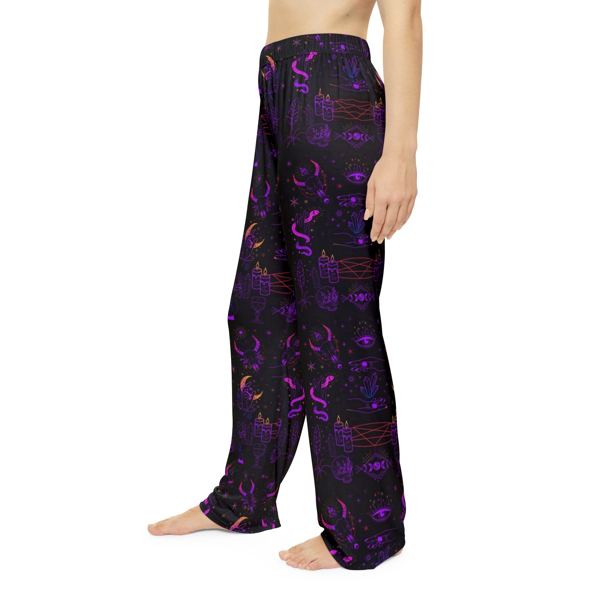 These occult pajama pants feature ritual symbols and animals representing transformation, protection, sacrifice, intuition, and primal power.